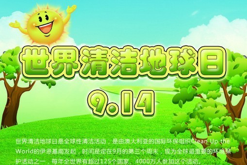 世界清潔地球日又名世界清潔日,英文為Clean Up the World Weekend (CUW Weekend),是全球性清潔活動(dòng),是由澳大利亞的國(guó)際環(huán)保組織Clean Up the World的伊恩基南發(fā)起,時(shí)間是定在9月的第三個(gè)周末,現(xiàn)為全球非常重要的環(huán)境保護(hù)活動(dòng)之一,每年全世界有超過125個(gè)國(guó)家、4000萬人參加這個(gè)活動(dòng)。2006年的世界清潔日活動(dòng)時(shí)間為9月15日至17日3天。也有參與組織和個(gè)人把每年的9月14日作為活動(dòng)時(shí)間。