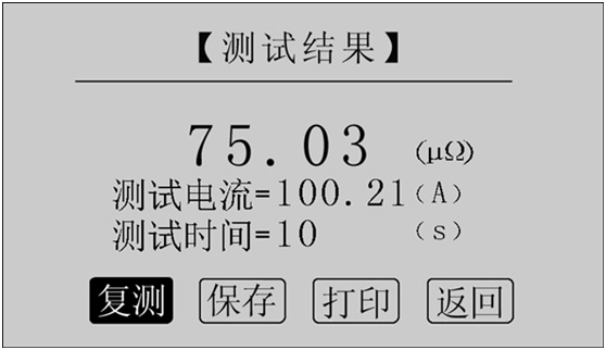 在主界面中選中“開始測試”項,點擊鼠標,儀器進入測試菜單界面,認測試電流為100A,測試時間為10s
