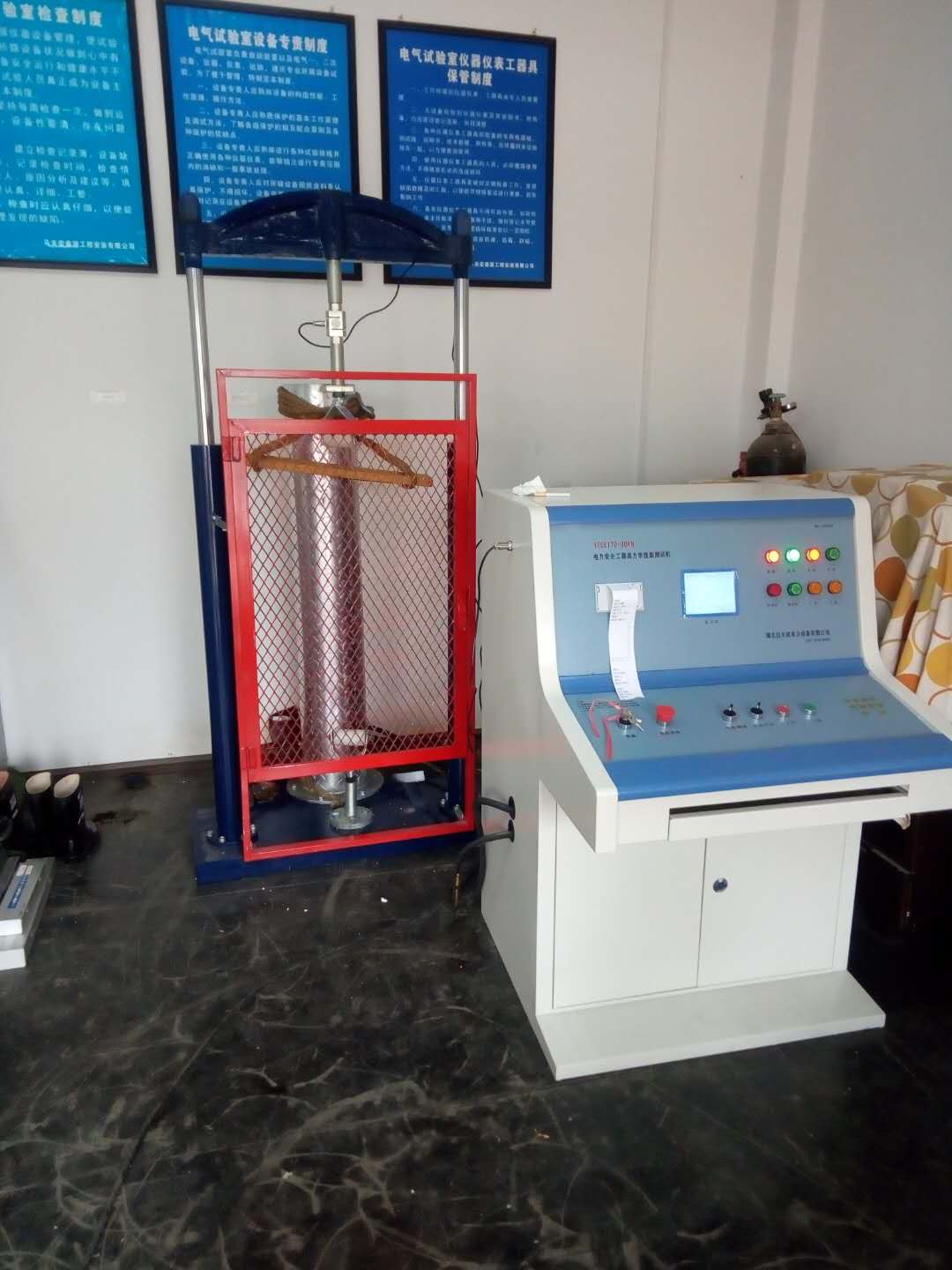 此次培訓的要設備是我公司的產品:YTC6170-3力安全工器具力學性能試驗機。試驗機是由液壓加載系統、安全帽試驗臺和微機測控系統組成。由測試顯示和加力設備兩部分組成(如需測安全帽配安全帽試驗臺) 測試顯示部分由拉壓力傳感器、控制鍵盤、液晶顯示屏、微型打印機、手動按扭等組成。本機設置兩個傳感器接口,兩只傳感器既可單獨使用,也可同時使用。能滿足不同使用場所環境的要求和工作要求,性能穩定,測試結果準確。