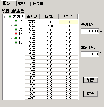 先在“參數”頁面中選擇“以基波的百分比表示”。然后在“諧波”頁面中選中IA,設置基波幅值為2A,并在表格中設置2次諧波為25%(大于諧波制動系數為20%,使保護開始試驗時不動作),如圖所示: