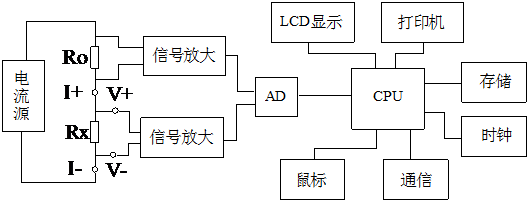 電流源的輸出恒流流過標準電阻R0和待測電阻Rx。采樣標準電阻R0上的電壓信號U0經濾波放大后,送入ad轉換,計算出電流值I,如式(1)所示。類似地,待測電阻Rx上的電壓信號UX經濾波和多級放大處理后被采樣并發送到ad以轉換為數字量。電阻值Rx由公式(2)計算。