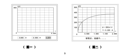 首先,在主菜單界面,旋轉鼠標將光標移動到【測試】選項上,按下旋轉鼠標選擇【伏安】即可進入伏安特性試驗設置界面。我們取出導線包中的(紅、黑)二次線,一頭插在 CT 的二次側,另一頭插在儀器的伏安特性輸出口上便可。然后我們設定好最大輸出電流和電壓后單擊【自動試驗】選擇【確定】試驗開始。此時裝置將自動按照設定值進行升壓升流,并記錄其數值(圖一)。當達到設定值后試驗結束,并進行簡單的退磁,當退磁結束后便進入試驗結果界面(圖二)。
