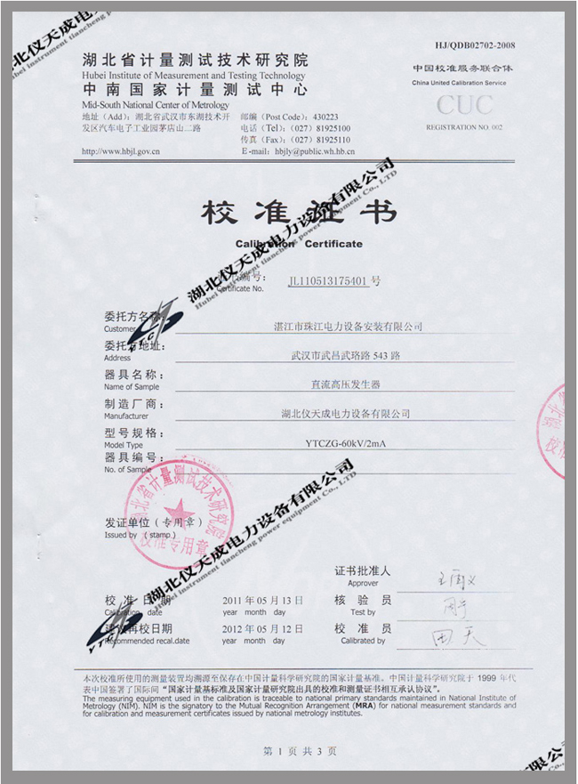 轉載:"YTCZG-60kV/2mA直流高壓發(fā)生器鑒定證書" 請注明來源于儀天成電力。 更多技術問題請致電儀天成電力客戶服務:027-87876585,技術部專線:027-87876585,在線客服:719388481