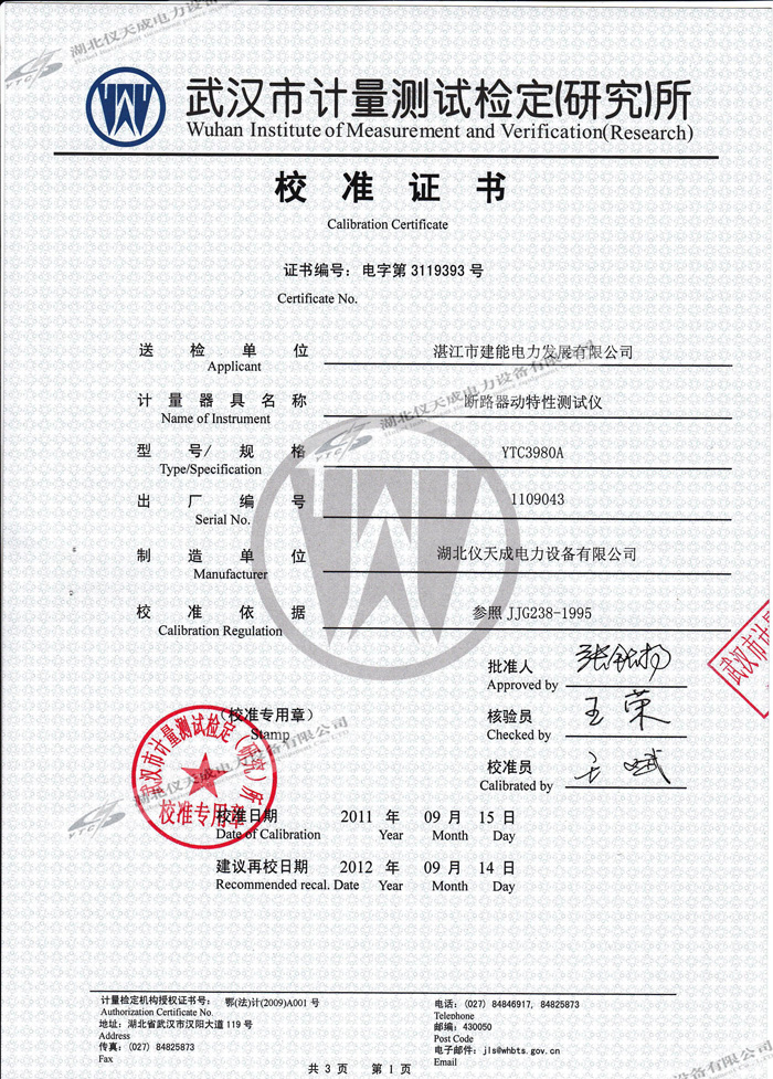 轉載:"YTC3980A斷路器動特性測試儀的資質證書" 請注明來源于儀天成電力。 更多技術問題請致電儀天成電力客戶服務:027-87876585,技術部專線:027-87876585,在線客服:719388481