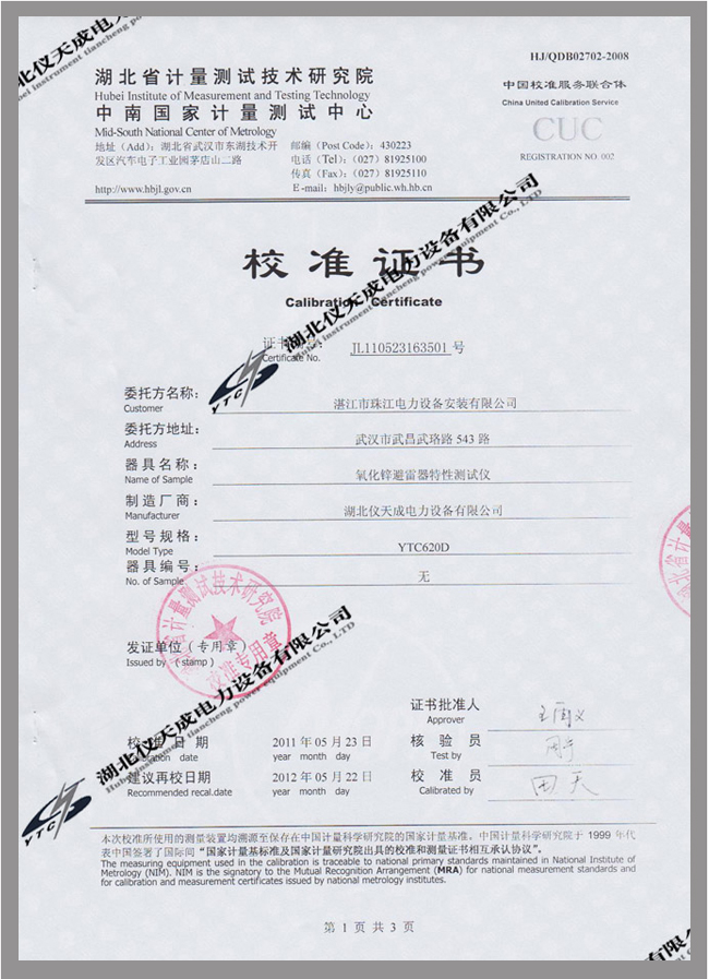 轉(zhuǎn)載:"氧化鋅避雷器特性測試儀鑒定證書" 請注明來源于儀天成電力。 更多技術(shù)問題請致電儀天成電力客戶服務(wù):027-87876585,技術(shù)部專線:027-87876585,在線客服: